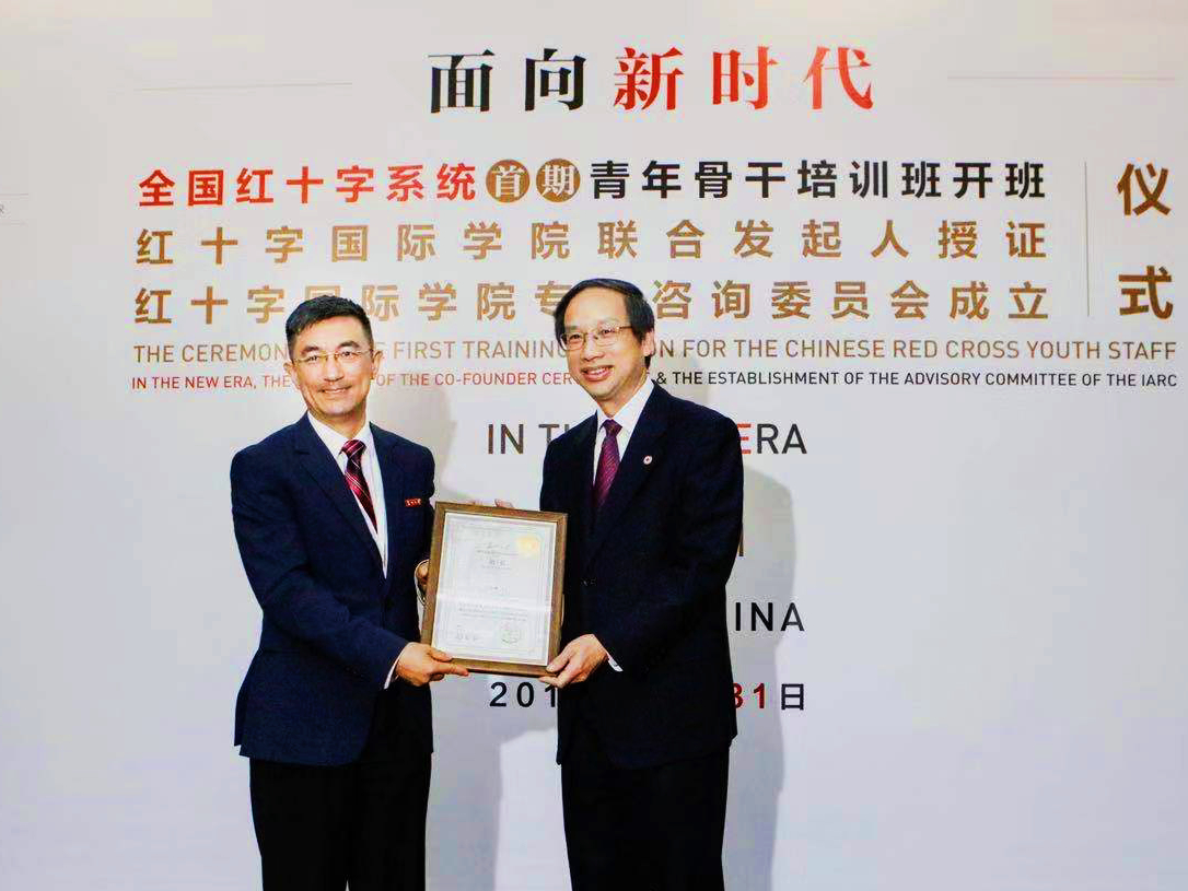在授课前的开班和联合发起人授证仪式上,陈竺为荣丰控股、爱尔眼科医院、恒瑞医药、名泽医疗、朝聚眼科医院、中国初级卫生保健基金会、中国人口福利基金会、广东省陈绍常慈善基金会以及江苏、苏州、内蒙古、山西、广东、安徽、四川、澳门红十字会等16家红十字国际学院首批联合发起人单位颁发证书。