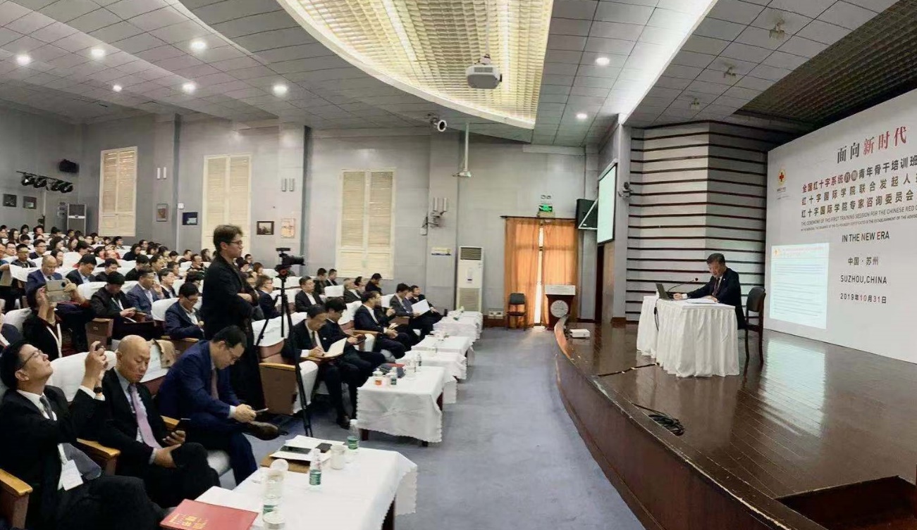 2019年10月31日,由中国红十字会总会主办、红十字国际学院承办的全国红十字系统首期青年骨干培训班在苏州大学正式开班。全国人大常委会副委员长、红十字会与红新月会国际联合会副主席、中国红十字会会长陈竺用英文以“对我国红十字会工作的若干思考”为题为学员讲授第一堂课。来自全国红十字系统的70余名青年骨干,以及红十字国际学院专家咨询委员会成员、苏州市红十字会干部、苏州大学学生共180余人听课。