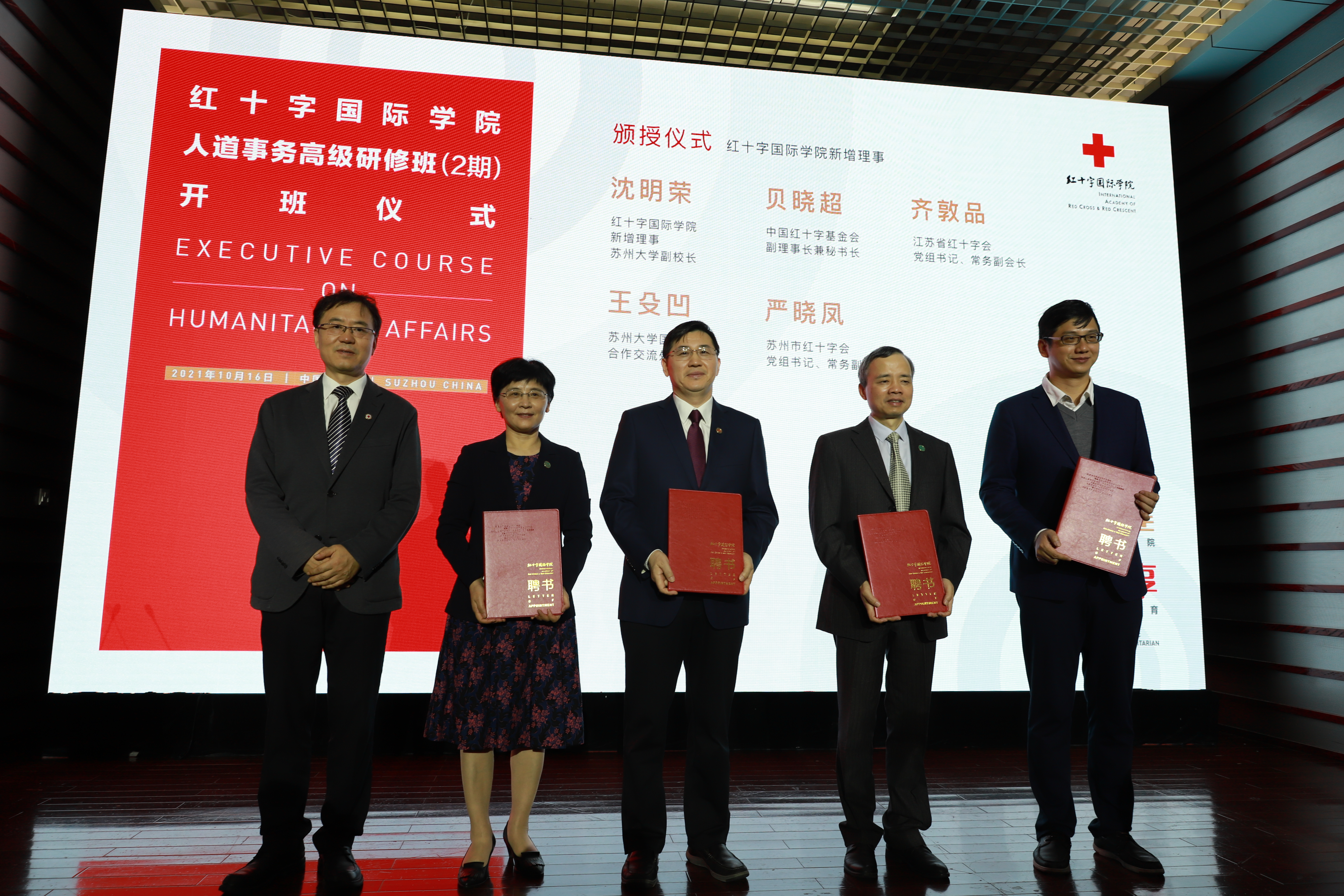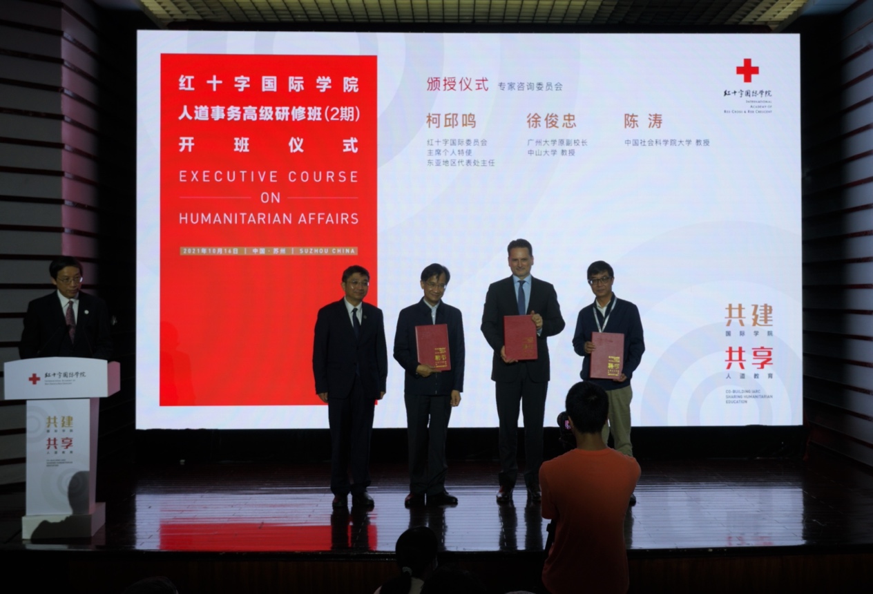 红十字国际学院专家咨询委员会成员,中国红十字会总会、中国红十字基金会、江苏省和苏州市红十字会以及苏州大学和红十字国际学院有关部门的负责人,第二期人道事务高级研修班学员参加了开班仪式。