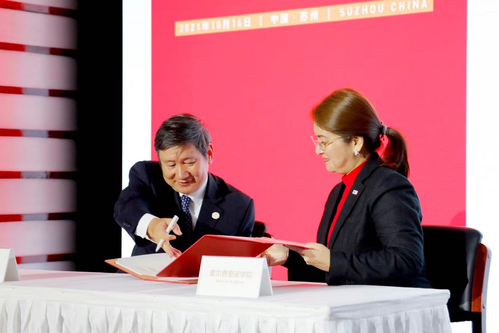 仪式上,红十字国际学院还与国际联合会所属的索尔费里诺学院签署了战略合作协议,双方将在人道教育科研资源共享、学术人才交流、人道领域领导人培训等方面开展合作,共推人道教育事业发展。红十字国际学院副院长刘选国与索尔费里诺学院授权代表彭玉美代表双方签字并互换协议。