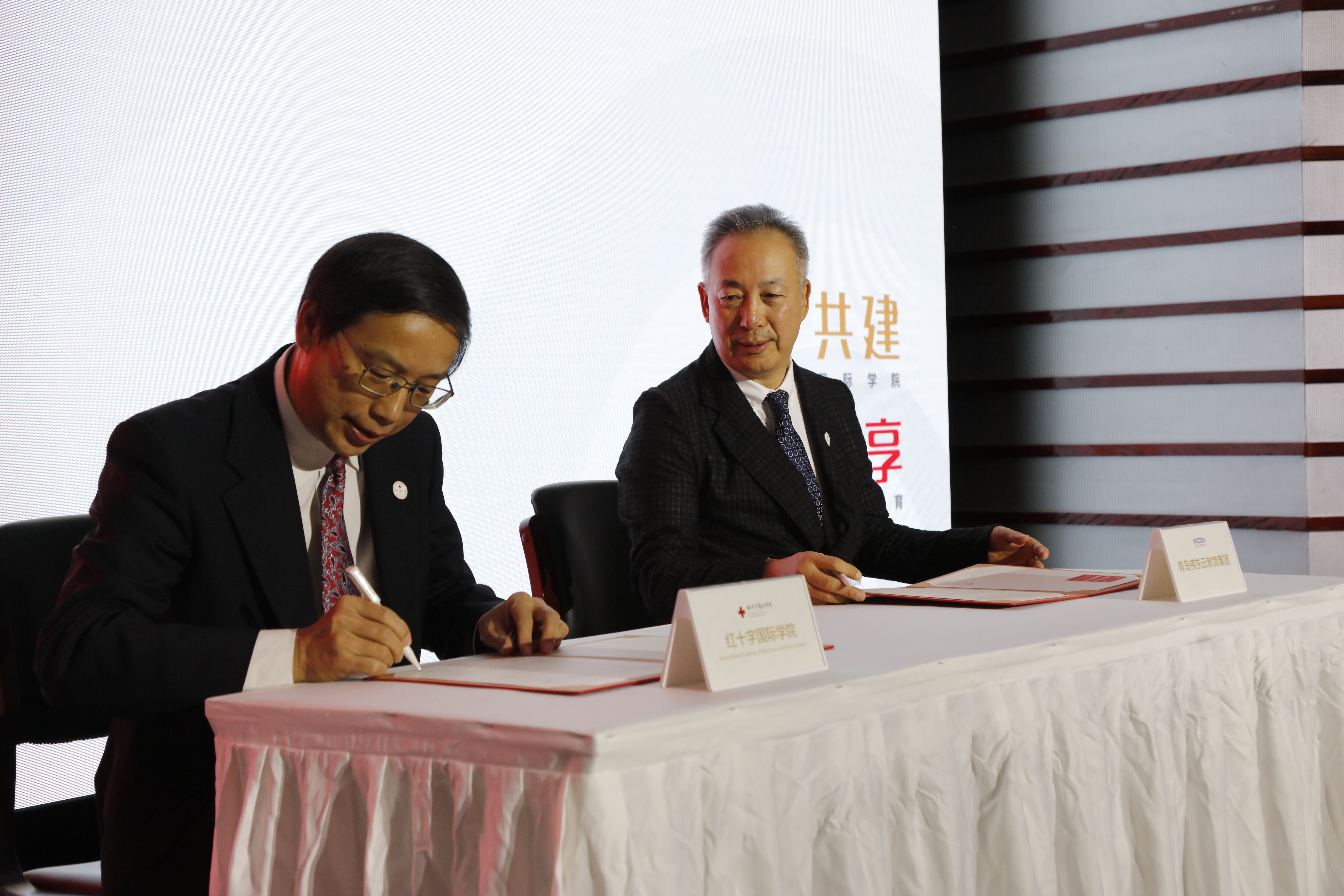 仪式上,红十字国际学院院长王汝鹏与伟东云教育集团董事长王端瑞签署合作协议,伟东云教育集团将出资500万元,开发建设面向全球的红十字国际学院云教育平台,为国内外红十字组织、会员、志愿者以及其他有志于人道慈善事业的用户提供网络教学、培训、交流的平台。