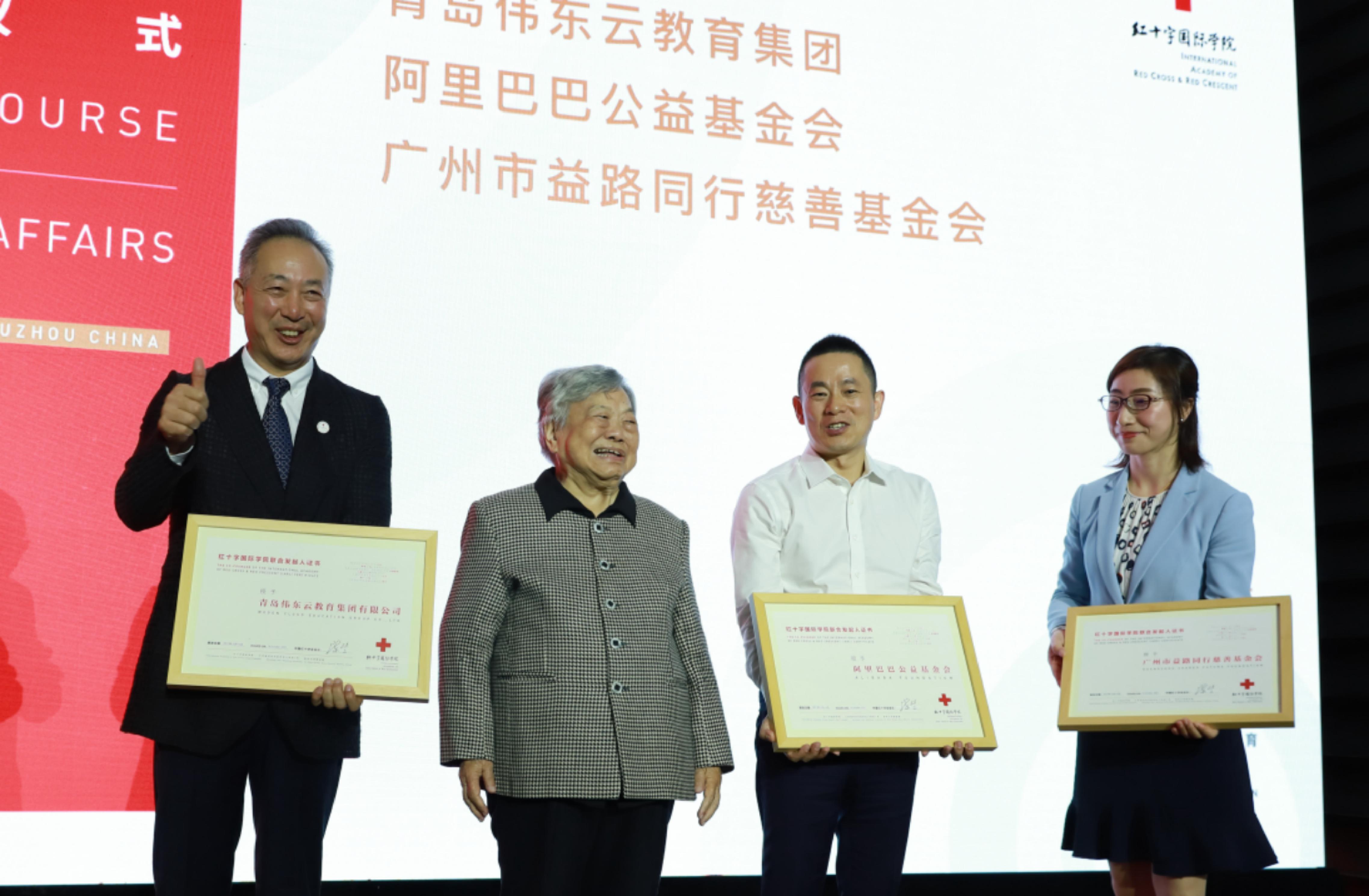 彭珮云向青岛伟东云教育集团董事长王端瑞、阿里巴巴公益基金会理事长孙利军、广州市益路同行慈善基金会理事长胡丹颁发了红十字国际学院联合发起人证书,感谢他们对学院建设的慷慨支持。至此,学院联合发起人单位已增至22家。