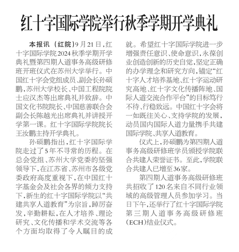 【中国红十字报】红十字国际学院举行秋季学期开学典礼