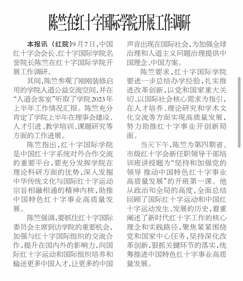 【中国红十字报】陈竺在红十字国际学院开展工作调研