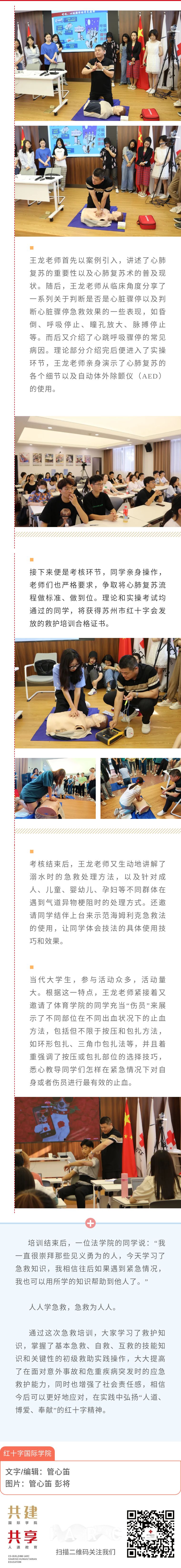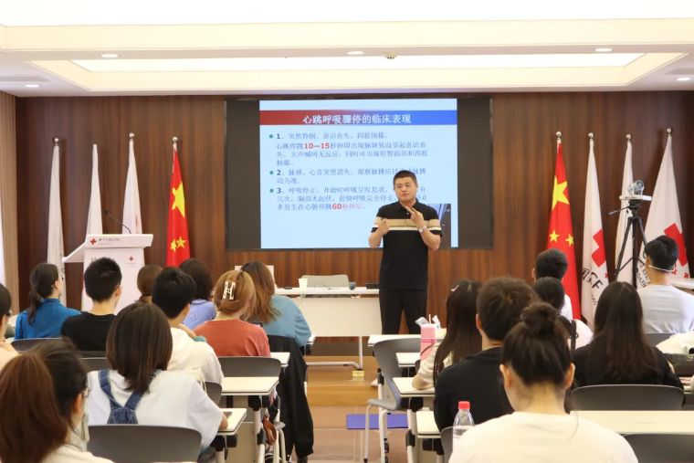 本次培训的内容分为四个部分,分别是心肺复苏和AED的使用、气道梗阻海姆利克急救法教学、溺水的有关急救知识和止血包扎。