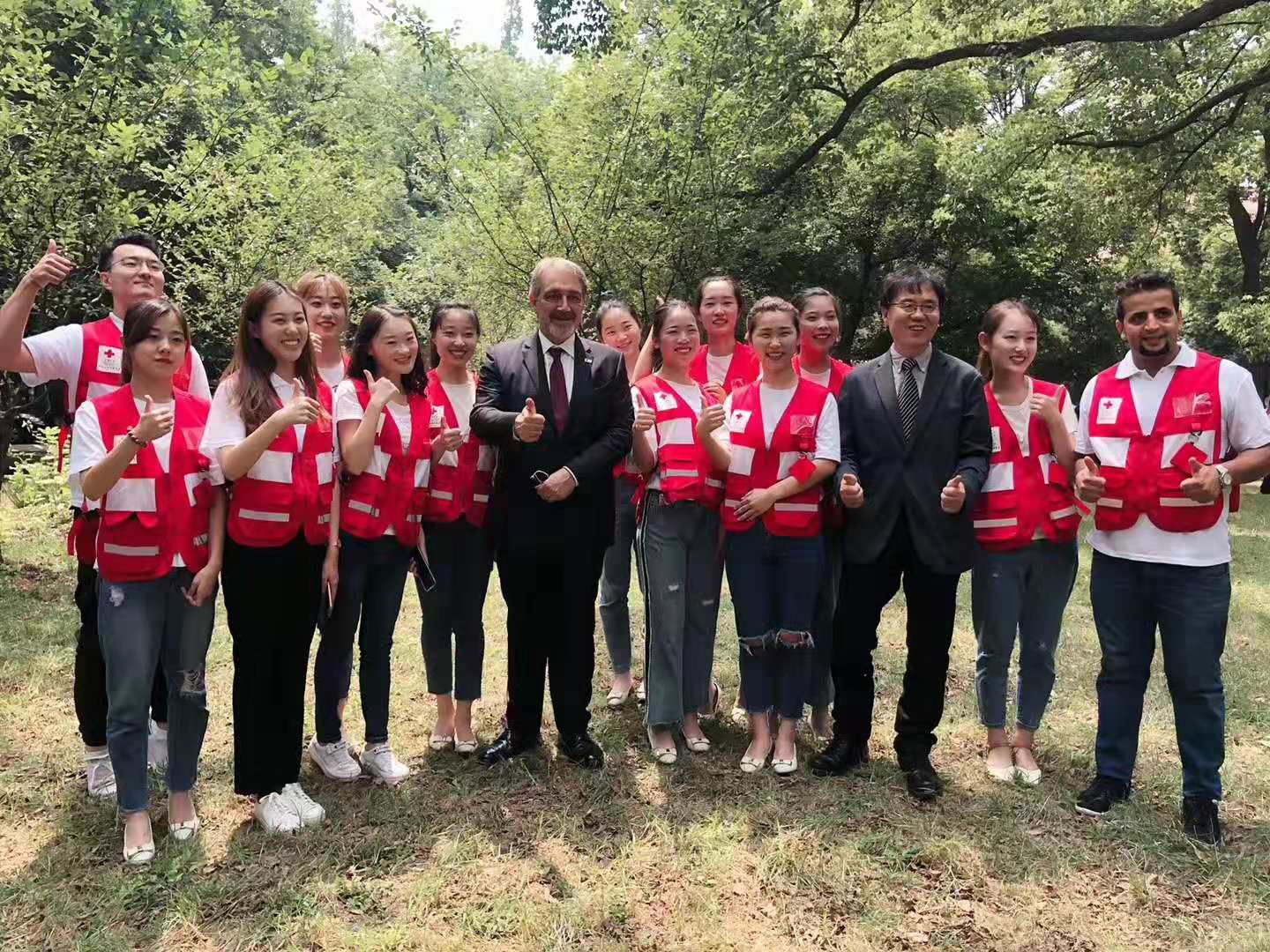 红十字会与红新月会国际联合会主席弗朗西斯科·罗卡、 中国红十字会副会长孙硕鹏与志愿者们 |